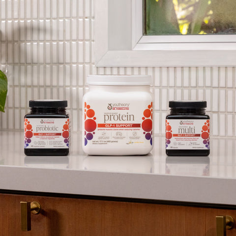 Youtheory® GLP-1 Support supplements are doctor-formulated to help fill common nutrient gaps and support overall well-being during your weight loss journey.* Our comprehensive formulas — including a High-Potency Multivitamin, 2x Action Probiotic, and Muscle Guard Protein powder — are designed to help combat these challenges.*